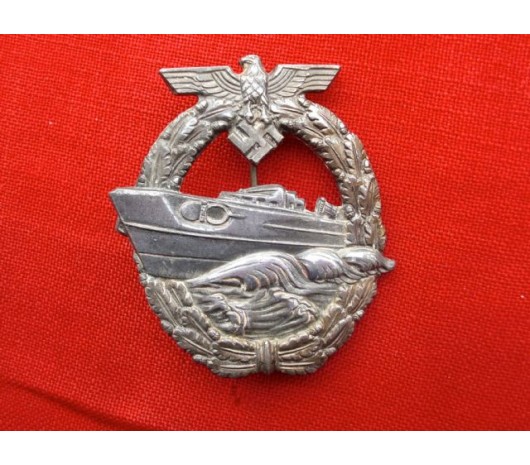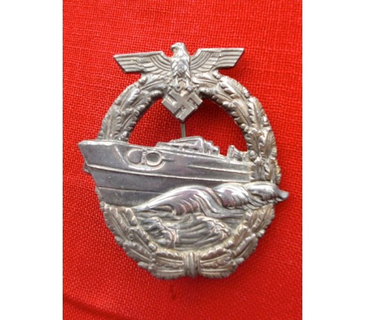 E-Boat War Badge, 2nd Model in zinc. Finish is gone, as shown. Maker marked "R.S.". Rare to find these. German Militaria(E-Boat War Badge)