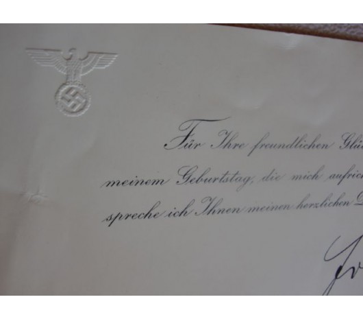 Hitler'ss Minister of the Interior, Wilhelm Frick's Thank You Card. Thanking recipient for birthday wishes. Dated March 1939 with stamped signature of Frick. Embossed eagle as shown. Very nice condition.