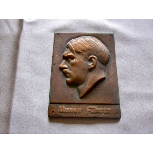 Bust of Hitler facing left with "Unser Führer" below. Bronze, approx. 4 1/4" X 5 3/4" in size. Nice .....