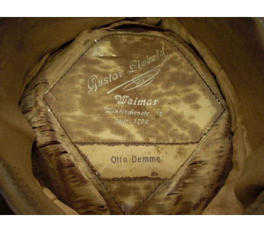 The set includes his private maker visor with his name still inside. The visor is red piped with good shape and a desirable maker, Gustav Liebold of Weimar. The visor has numerous moth holes as shown in the pictures.