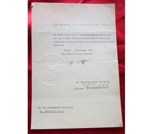 Hitler signed document dated 13. March 1939 dismissing Major William from active military service with the right to wear his former uniform. The document is counter signed by Army Commander in Chief von Brauchitsch. Embossed NS eagle to document.