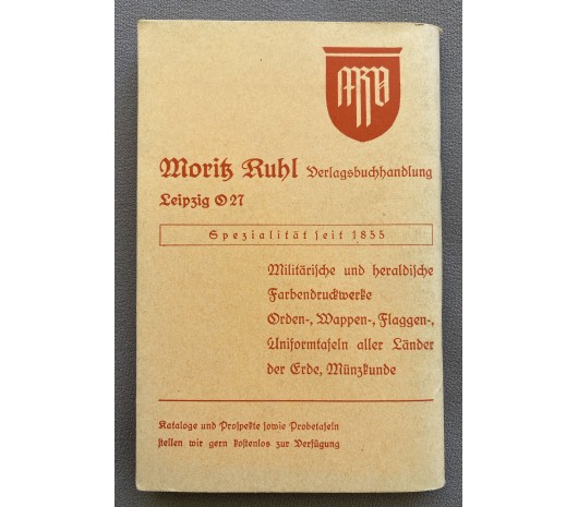 Deutsche Uniformen Verlag Moritz Ruhl Leipzig. I believe this to be a post war re-print because it is in such good condition. About 64 pages with a lot of color rank charts, etc. Approx. 3 3/4" X 5 3/4" paperback