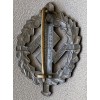 SA Sports Badge in Bronze. Bronze washed example has the second pattern (1935-39) inscription, "Eigentum D. S.A. Sportabz. Hauptstelle" (Property of-the S.A. Sports-badge Head-department) embossed to its reverse. The reverse also has the embossed maker's name "Karl Hensler Pforzheim".