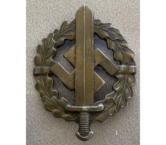 SA Sports Badge in Bronze. The reverse marked, "Eigentum d. S.A. Sportabzeich Hauptstelle" (Property of-the S.A. Sports-badge Head-department) and maker "Berg & Nolte, A.G, Lüdenscheid". Very nice condition.